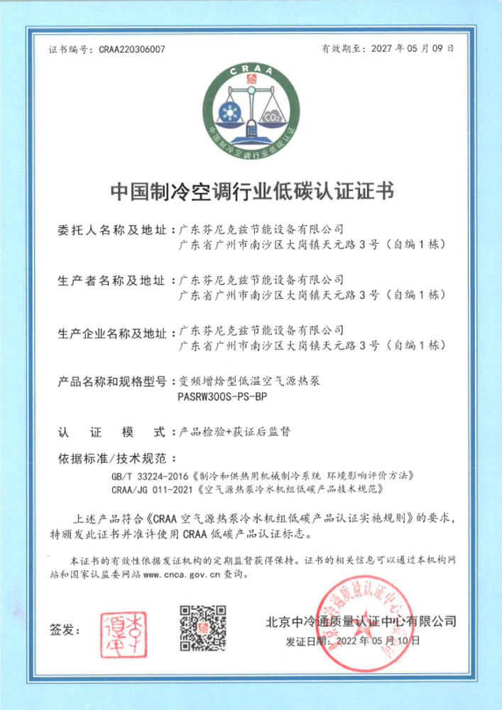 為了響應國家碳達峰、碳中和目標,5月我司拿到30P和70P低溫熱泵、50P冷水機“低碳認證”證書,該產品認證證書意味著未來發(fā)展的趨勢,順應國家政策,推動企業(yè)升級的手段。成為中國制冷空調行業(yè)“雙碳領導小組”,響應國家號召并推動各項認證和評價活動的首批熱泵廠家。