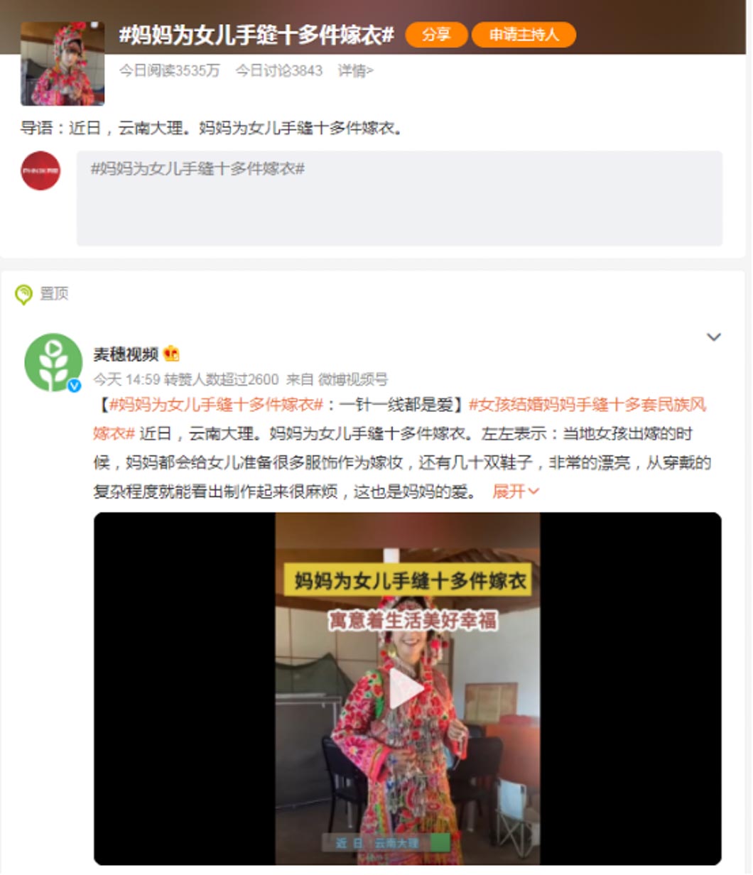 近日,云南大理一媽媽為女兒手縫十多件嫁衣的視頻在網(wǎng)絡(luò)上引起熱議,一度沖上了熱搜。