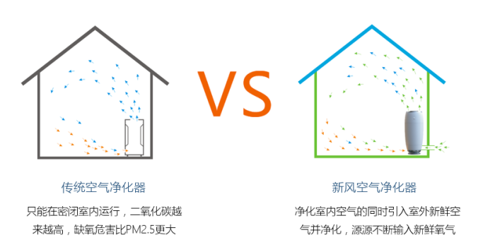 新風系統通過風機將室外空氣引入室內,并通過全熱交換器回收空氣中80%的溫度和濕度,以達到室內外空氣的交換和節能的目的,讓室內的空氣潔凈清新。空氣凈化器通過不同的過濾技術(如HEPA過濾器、活性炭過濾器、紫外線殺菌等)去除室內空氣中的污染物和異味,目的是通過過濾、吸附、殺菌等方式凈化室內空氣,去除污染物和臭味。兩者通俗易懂的說法來說,新風系統是外循環,空氣凈化器屬于內循環。